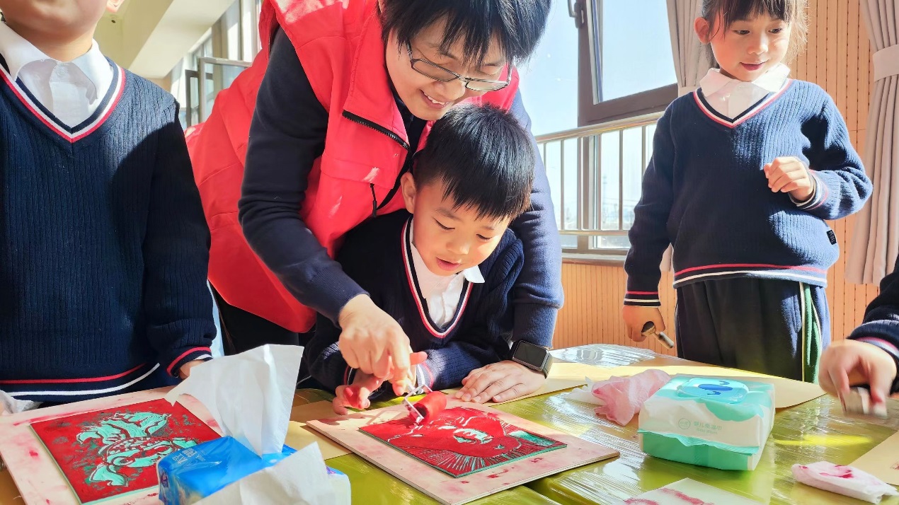 幼儿园小朋友们以优美的舞蹈《幸福的远方》拉开了此次活动的序幕。活动现场,艺术设计系党支部志愿者为幼儿园师生介绍了拓印历史及制作流程,和大家一起挑选了“人民的小推车”“雷锋头像”“莲花”等拓印底板,手把手指导孩子们完成拓印作品,引导大家传承非遗技艺,感受劳动之美。