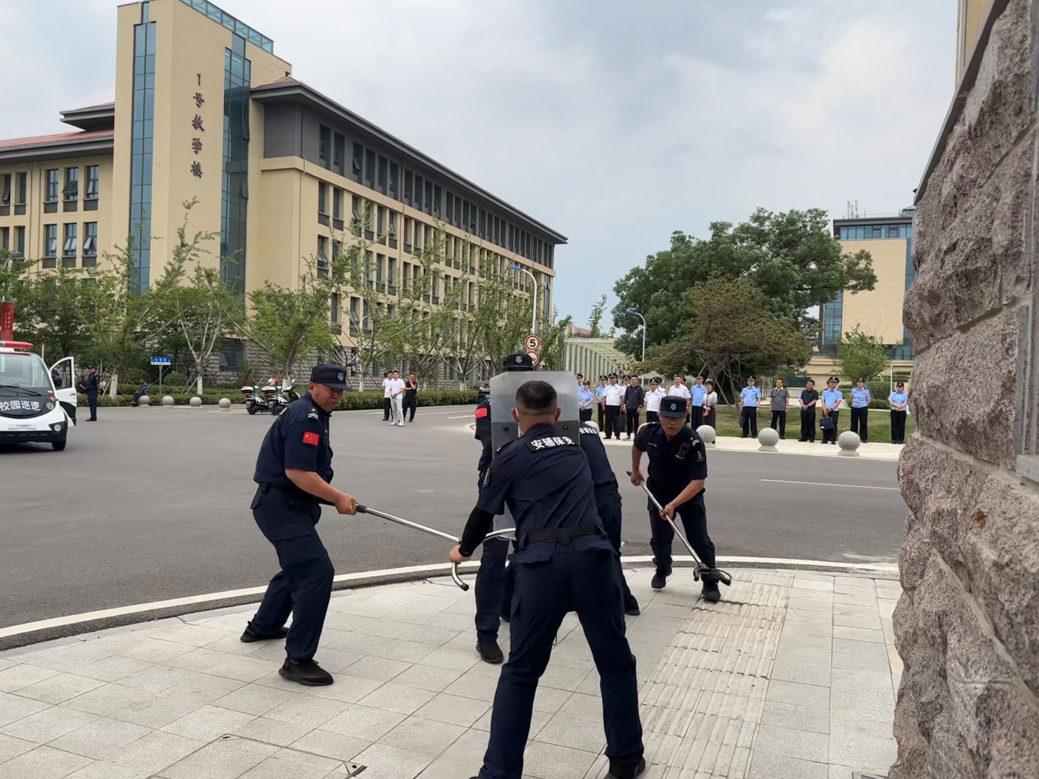 活动最后,全体人员在东门广场观摩校园保安队伍突发暴力事件处置演练。模拟“歹徒闯入校园”场景,保安队员迅速启动应急响应机制,通过防暴器材协同作战,成功控制“嫌疑人”。演练全程紧张有序,充分展现了学院安保队伍的专业素养和应急处突能力,为警校深化安全保卫合作提供了实践范本。