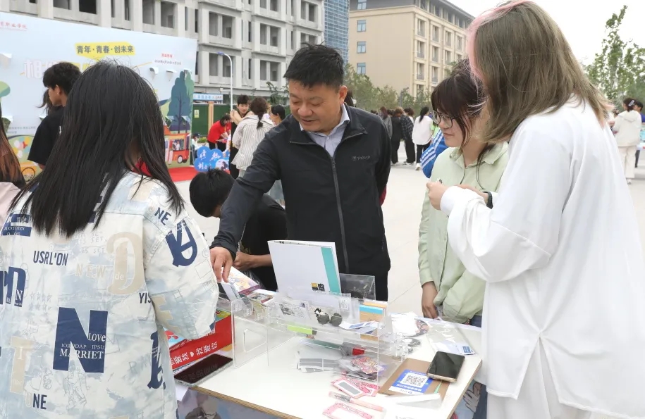 学院党委书记杨磊也来创业市集啦!同学们的热情更加高涨,积极推介自己的创意商品。