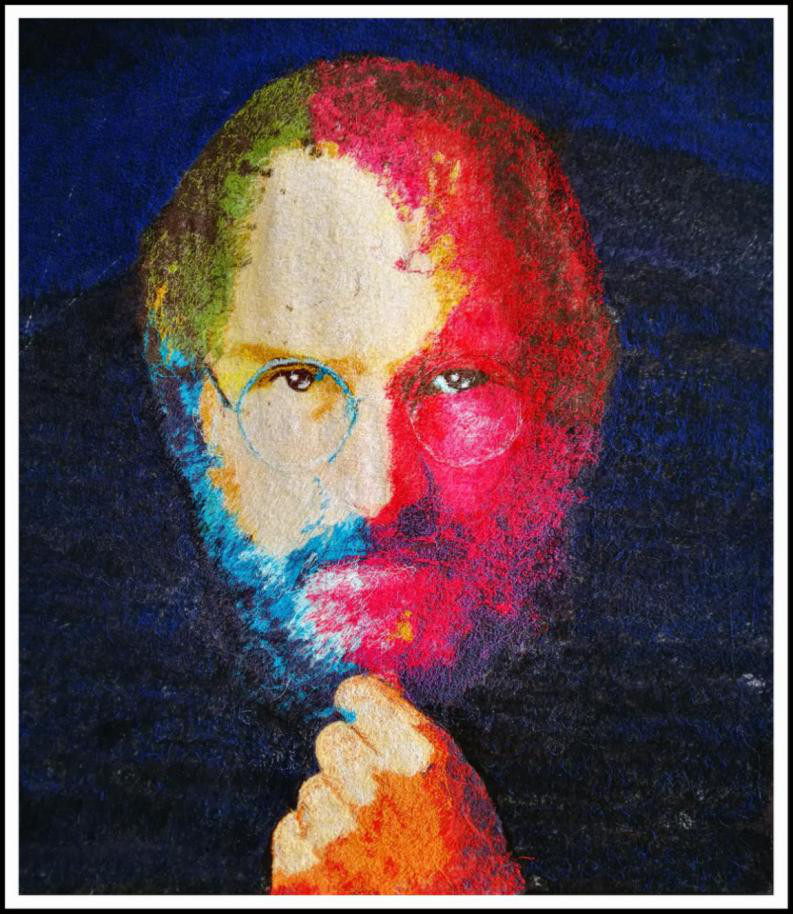《乔布斯》在表达时,采用波普艺术的表达形式,在色彩上大胆设色,细节上刻画入微,传神......这三幅作品作品耗时近一个月时间。作品从技法的探索到技法的形成,从针法的运用到色彩的搭配,作品的诞生如同自己的孩子出生一般,经历了阵痛之后是幸福与喜悦。