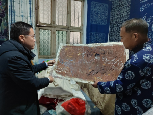 第二天拜访了国内唯一的一位传统手工彩印花布艺人、山东省彩印花布传统印染技艺传承人张明建先生、临沂市彩印花布传统印染技术代表性传承人张继胜先生,调研了张明建彩印花布博物馆和中国非物质文化遗产种植印染传习基地。通过调研,大家了解了彩印花布的发展历史,了解了彩印花布图案的丰富内涵和美好寓意,认识了植物染的植物种类,学习了打靛技艺和建缸的方法。