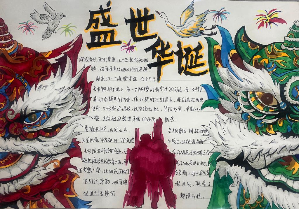 活动中同学们纷纷发挥自己的想象力和创造力,积极投入到手抄报的制作当中。他们围绕庆祝新中国成立75周年这一主题,精心设计版面,用五彩斑斓的画笔描绘出祖国的壮丽山河,如雄伟的长城、奔腾的黄河等,这些画作栩栩如生,仿佛将祖国的大好河山搬到了手抄报上。同时,用深情的文字表达对祖国的热爱与祝福,有的讲述新中国成立75年来在科技领域的巨大突破,如从航天事业的飞速发展到5G技术在全球的领先地位;有的展示中国共产党人的历史使命、强国实践;有的回忆革命先辈的英勇事迹,字里行间都洋溢着对祖国母亲深深的敬意。学生在手抄报展览中,互相学习,通过这种方式,能够直观地理解和感受党的历史和精神。