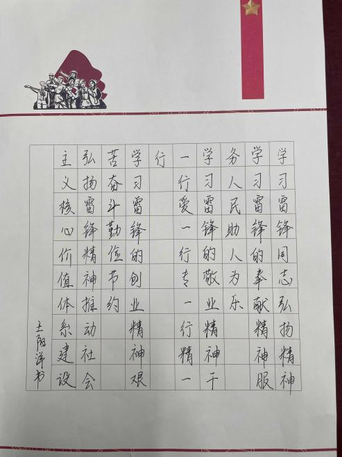 为进一步加深同学们对雷锋精神的理解与感悟,服装艺术系团总支举办了学雷锋书画比赛。活动得到了学生的热烈响应,收到了大量优秀作品。绘画作品中,有的生动描绘了雷锋帮助战友修车的场景,有的细腻刻画了雷锋帮助困难群众的情景,有的绘出了雷锋专注看书的画面,色彩鲜明、笔触灵动,将雷锋的形象鲜活地展现出来;书法作品则以刚劲有力或飘逸灵动的字体,书写着雷锋的名言警句、感人故事,一笔一划都饱含着对雷锋精神的敬仰。