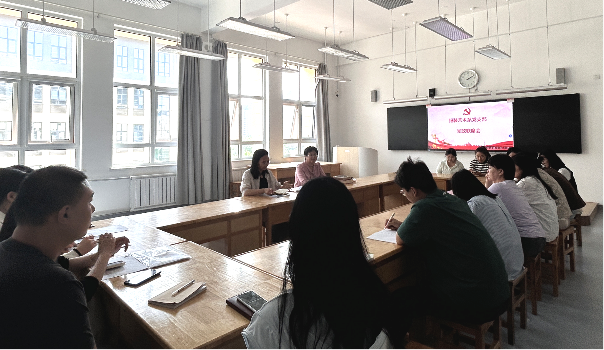 2025年5月26日下午1时30分,服装艺术系召开系部会议(党政联席会议)。服装艺术系书记周琴、系部负责人沈玉迎以及系部全体教师参加此次会议。