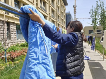 2024年4月16日上午,后勤管理处、学生工作处联合物业人员为残障学生集中晾晒被褥。