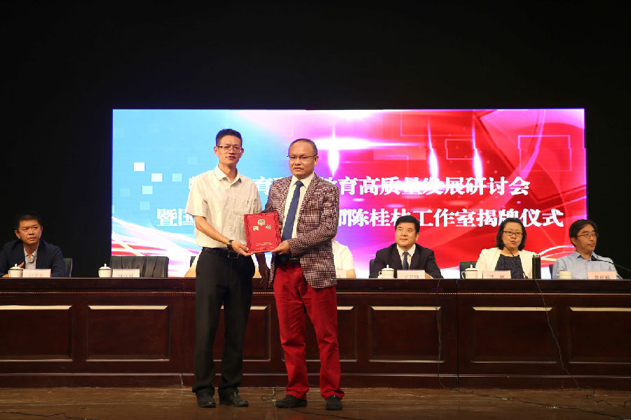 学院院长李心沁为卓越师资教育学院院长、广东省卓越师资教育研究院院长陈桂林颁发特聘教授兼大师工作室主持人证书。