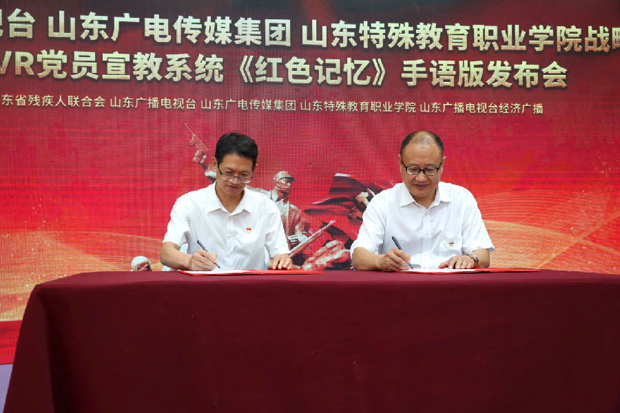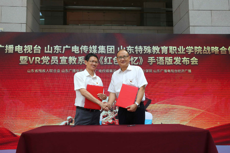 7月1日,正值党的99周岁华诞。在这个具有特殊纪念意义的日子里,学院与山东广播电视台、山东广电传媒集团成功举办了战略合作启动仪式暨全国首套手语版VR党员宣教系统《红色记忆》发布会,向党的生日献礼。山东省残联副理事长、党组成员黄庆峰,山东广播电视台党委副书记张卫华,山东广电传媒集团筹备组组长,山东广电视觉科技董事长张先,学院院长李心沁出席了本次活动。