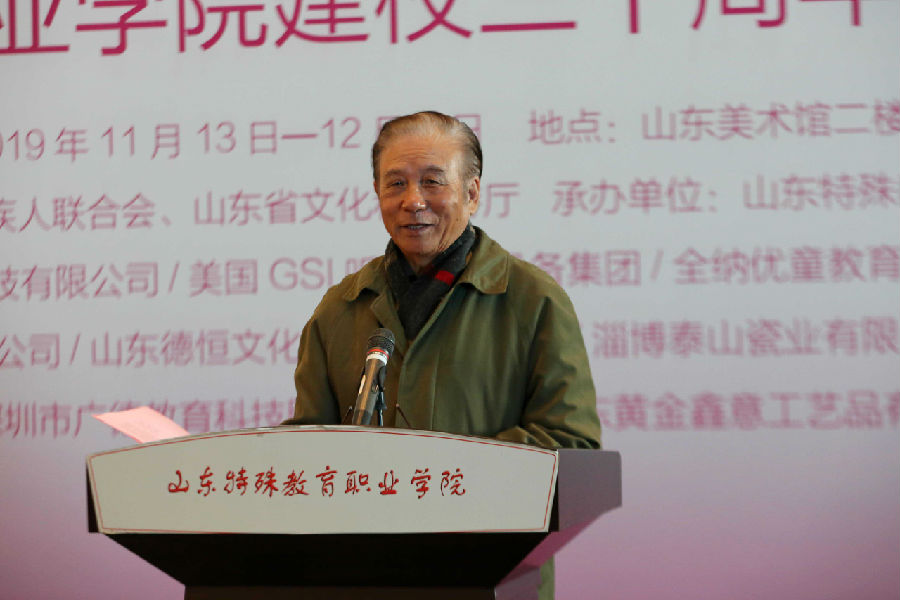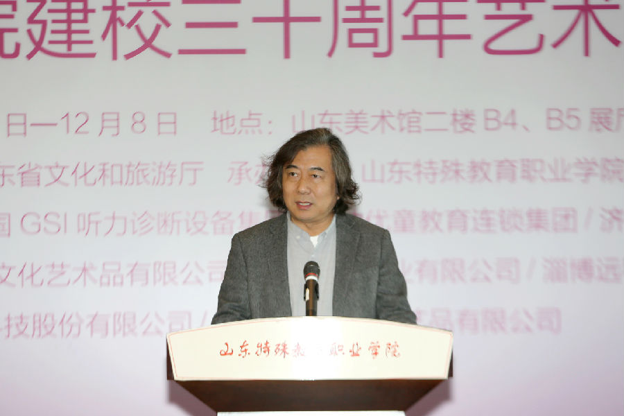 张望在致辞中代表山东美术馆、山东省美术家协会,向学院建校30 周年表示祝贺。他指出,此次展览旨在传递真、善、美与爱的正能量,为更多特殊群体中有艺术才能的孩子提供展示的平台,发现和培育他们的艺术梦想,增进社会对他们的认知与重视程度,从而激发他们创作出更多表达其独特内心感受的艺术作品,更好的带动全社会帮扶、支持这些孩子们的成长成才。