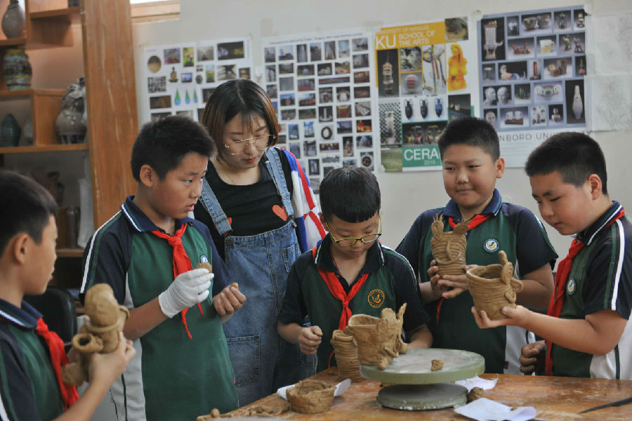 据悉,山东省青少年宫于2018年4月向各企事业单位发出了关注中小学生社会实践、加入中小学生社会实践基地平台的倡议,得到了广泛响应。此次,山东省青少年宫从全市中小学中遴选的来自13个学校共计190名学生,从6月30日到7月5日,分批次来kaiyun开云官方在线入口艺术设计系,体验了剪纸、扎染、蜡染,纤维编织、衍纸、陶艺拉坯、陶艺泥板成型、陶艺泥条盘筑、瓷板手绘、玉石雕刻等十个民间传统工艺职业岗位。来访的中小学生们对其所参与的工艺美术品设计实践充满了好奇心与新鲜感,他们认真聆听老师们授课,积极动手体验,与学院听障学生进行交流互动。