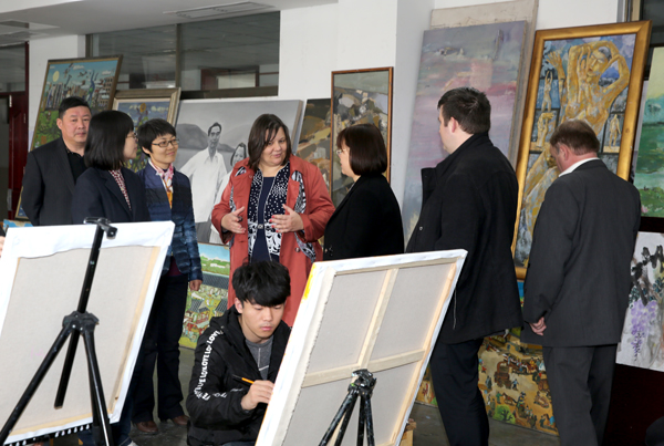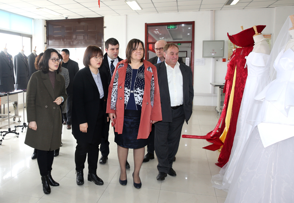 李心沁代表学院向Zsebe Andrea女士一行表示热烈欢迎,并向来宾简要介绍了学院办学基本情况,随后陪同Andrea女士一行先后参观了学院学生艺术作品展览馆和特殊教育、服装设计、工艺美术等专业工作室。