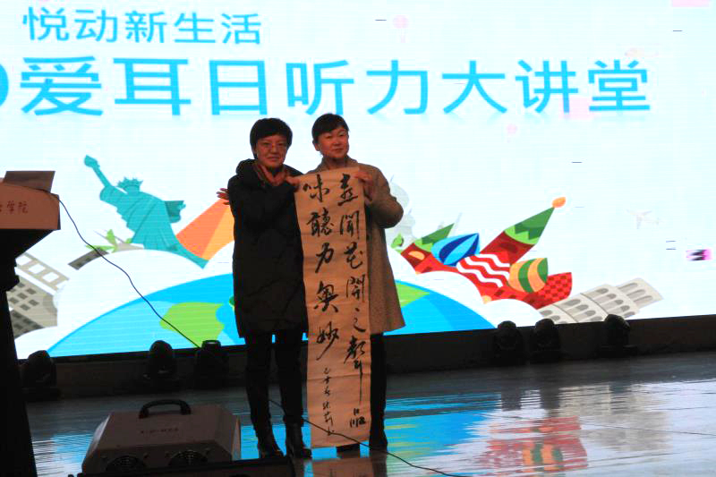 张莉表示,今年全国爱耳日的主题是“关爱听力健康,落实国家救助制度”,根据中国聋协协的要求和听力残疾人的需求,在全国十多个城市同时举办“双耳畅听,悦动新生活”听力大讲堂品牌活动,目的是推动听力和康复知识的普及,助力听力残疾人实现美好生活的愿望。此次活动的成功举行,得益于学院党委的大力支持、周密安排和奥地利听力植入公司的大力赞助,为此,张莉代表省聋协向学院和公司分别赠送了“桃李不言,下自成蹊;特教育人,誉满天下”“喜闻花开之声,品位听力奥妙”的书法作品。