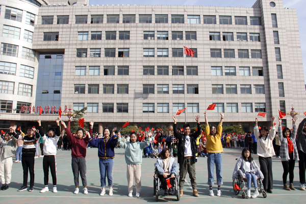 上午9点半,刚刚下课的同学们纷纷从教室走向操场的时候,校园广播里传来了优美的《红旗飘飘》乐曲。正当同学们疑惑不解的时候,一群手举国旗的同学跑向操场,伴随音乐舞动起来。高亢的乐曲、充满张力的舞蹈表演迅速吸引师生们驻足观看,迅速围拢过来。当视障、听障、肢体功能障碍的同学们和健全同学一起合唱时,围观的师生被现场气氛所感染,都不约而同地齐声歌唱,抒发对祖国的热爱之情,将快闪活动推向了高潮。