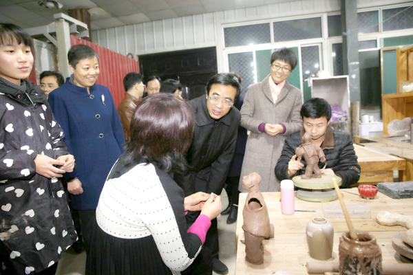 程凯一行先后视察了学院服装艺术系、艺术设计系各工作室。参观时,程凯副主席或热情地与专业教师握手慰问,询问专业教学情况;或停步耐心观看学生创作,关切残疾学生们的学习和生活。遇到令人心动的作品或创作场面时,还兴奋地拿出手机拍照留念。