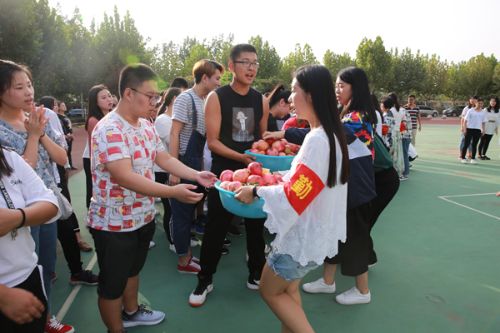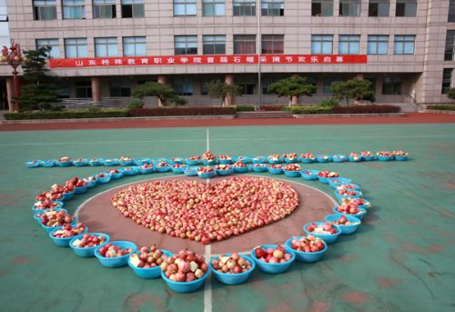 次日,学院在中心广场举行了石榴分享活动。同学们将收获的石榴摆放在广场上,载歌载舞庆祝丰收,并将收获的石榴分发给特教大家庭的每一组成员——学院教职工,安保及物业等服务人员,以及各班级同学,共享丰收喜悦,品尝香甜与甘美。