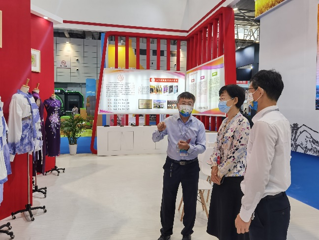 文旅部部长胡和平、省教育厅副厅长孙晓筠、省文联主席潘鲁生莅临学院展区参观指导,学院院长李心沁热情地介绍了学院展区项目。胡和平、孙晓筠一行对学院的人才培养、实践教学、服务产业发展等工作给予了充分肯定,对学院非遗文创作品给予高度评价,并与听障学生亲切交流,一起创作木板印画,感受传统文化和技能之美。