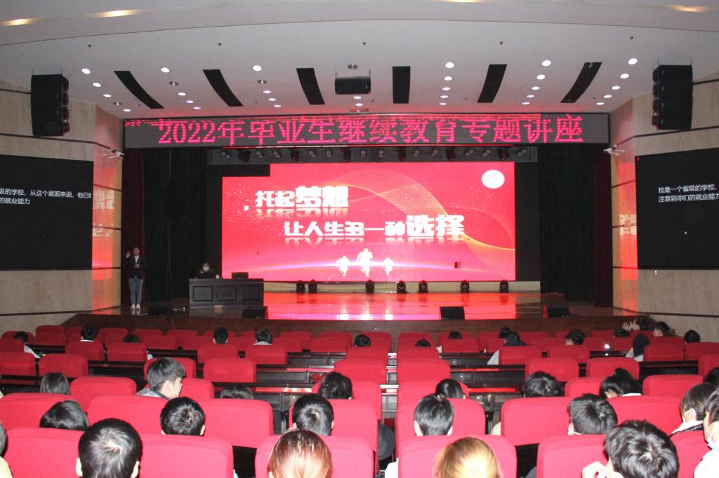 11月26日下午,学院继续教育中心在大礼堂组织开展“托起梦想,让人生多一种选择”—2022年毕业生继续教育专题讲座。毕业班级学生,各系党支部副书记、辅导员、班主任及部分老师和工作人员共300余人参加了本次讲座。
