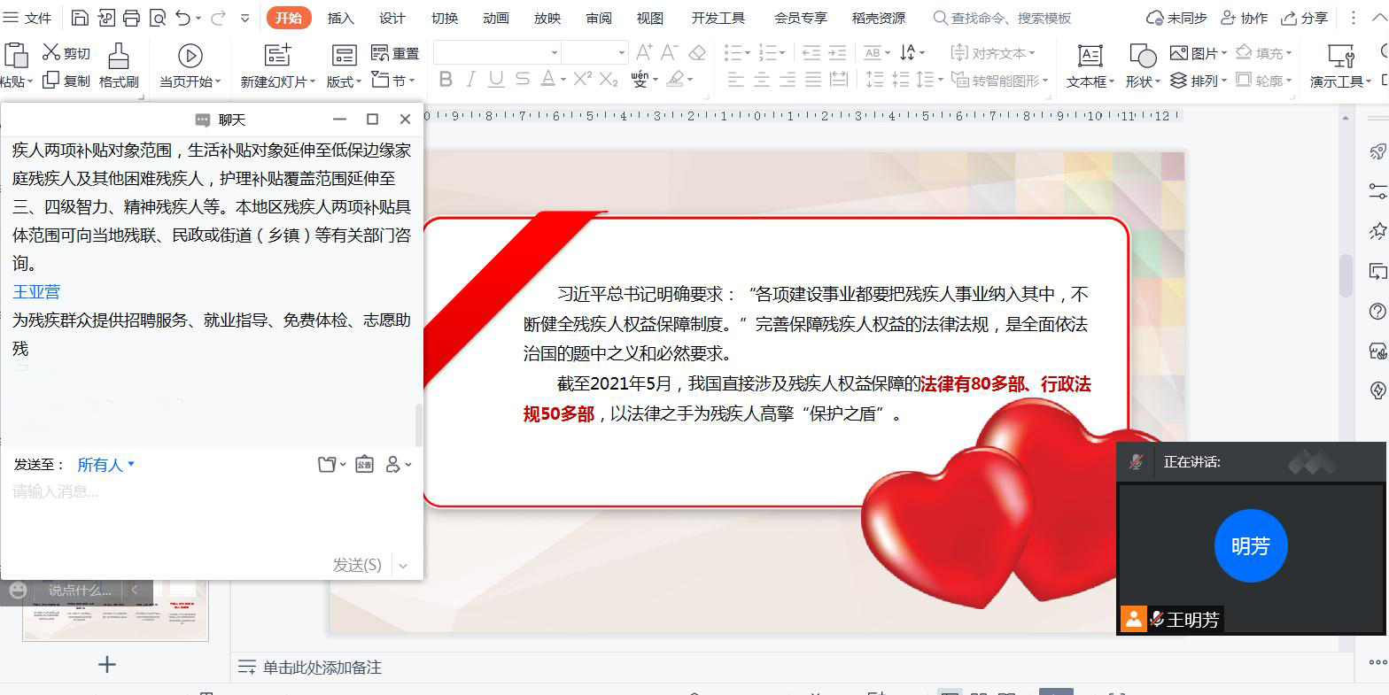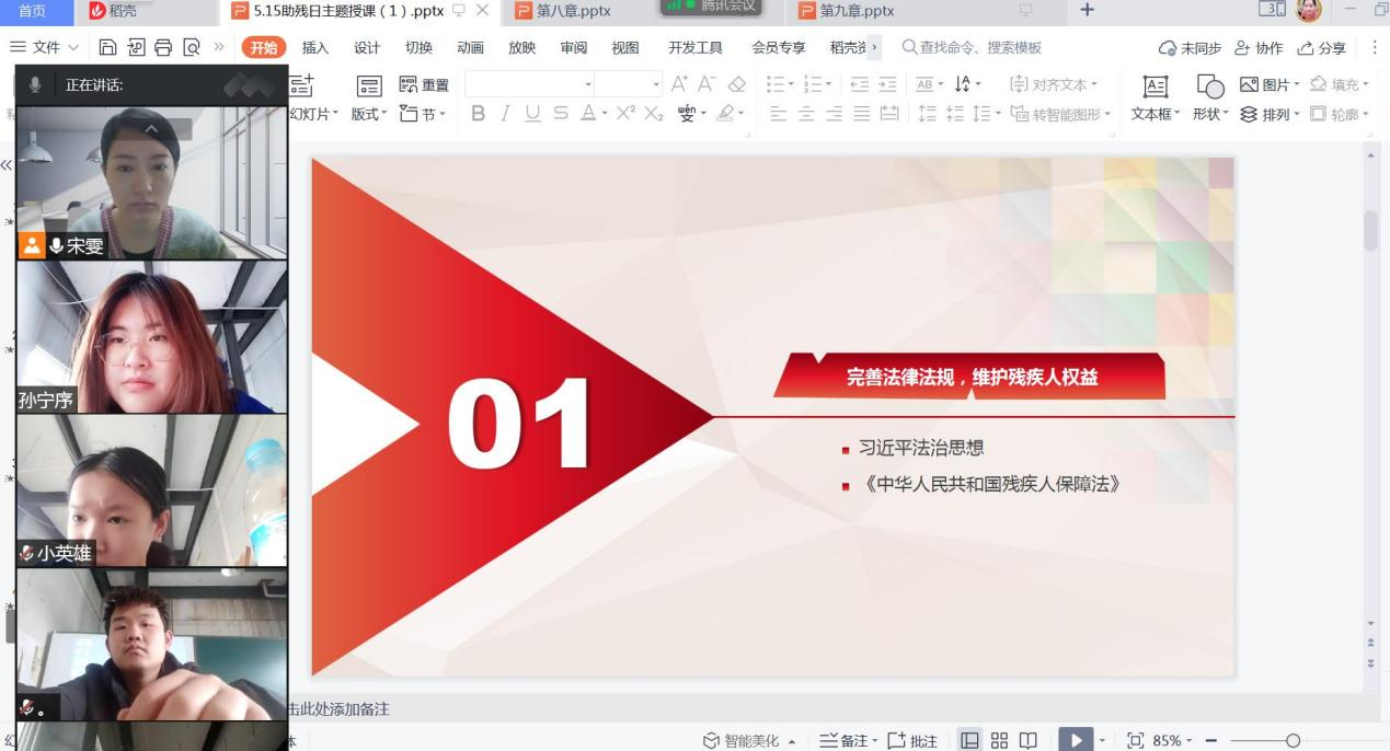 思政教学团队从习近平法治思想、“十四五”残疾人保障和发展规划、残疾人权益保障等方面讲述了我国残疾人事业飞速发展的历程,对《中华人民共和国残疾人保障法》进行了重点讲解,增强了残障学生的法律意识和维权意识,也让习近平总书记的“各项建设事业都要把残疾人事业纳入其中,不断健全残疾人权益保障制度”的暖心话语真正播种到每一位残障学生的心中。