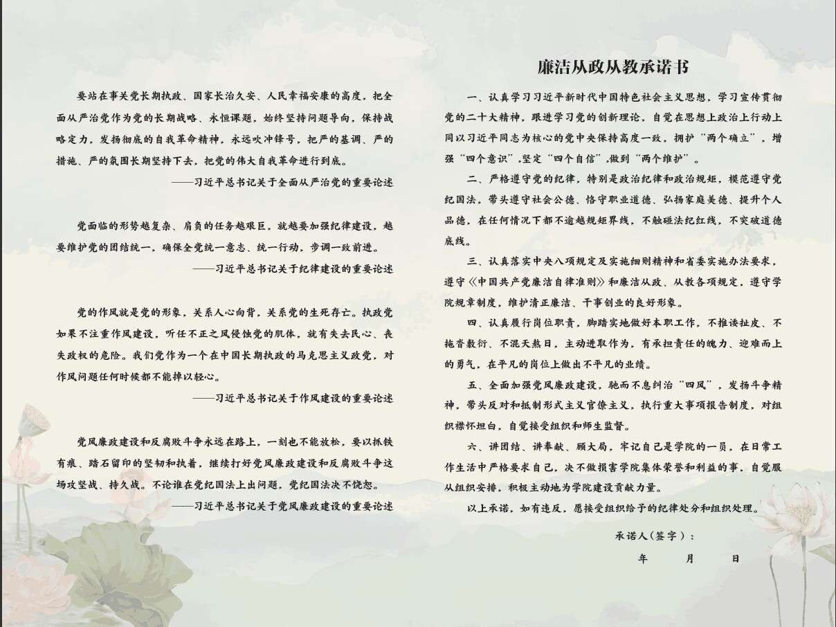 会上,党委书记与党委委员,党委委员与党支部、部门负责人分别签订《2023年度全面从严治党责任书》,教职工代表签订《廉洁从政从教承诺书》,进一步明确了从严治党工作目标责任,确保层层传导压力,级级压实责任,推动管党治党各项工作落到实处。