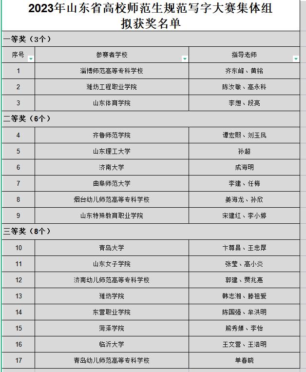 近日,在山东省教育厅、山东省语言文字工作委员会举办的“2023年山东省高校师范生规范写字大赛”中,学院2021级特殊教育专业学生窦艺情获得一等奖,王俊莹等7人获得二等奖,陈禧等8人获得三等奖,学院荣获集体组二等奖,宋建红、李小婷获优秀指导教师奖。