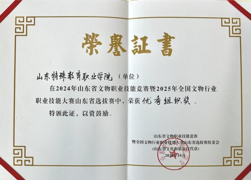 10月21-23日,山东省“技能兴鲁”职业技能大赛——2024年山东省文物职业技能竞赛暨2025年全国文物行业职业技能大赛山东省选拔赛在山东曲阜举行,学院文物修复专业师生荣获二等奖1个,三等奖2个,优秀奖2个,学院荣获优秀组织奖。