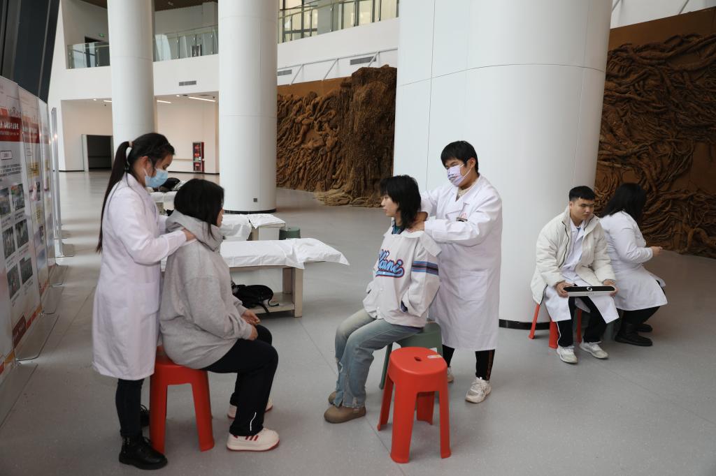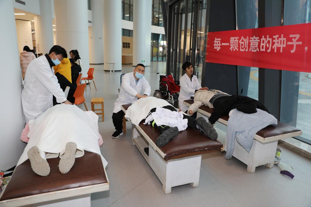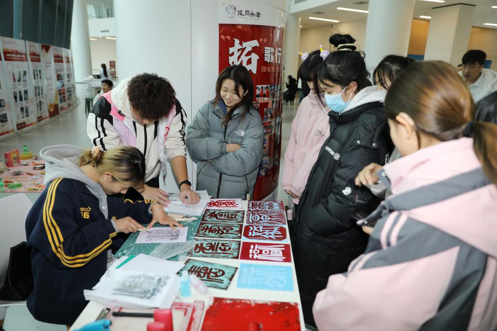 飞扬的冬雨抵挡不住市集的热闹非常。手工饰品、解压玩具、草莓塔、寿司、套圈、专辑周边、二手小说、二次元……30多个摊位琳琅满目。其中,不少摊位以中国传统文化为主题,推出了版画、中医推拿等现场体验区,不仅体现了专业特色,专创融合,也吸引了众多师生驻足观赏体验和购买。