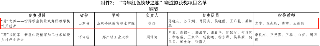近日,中国国际大学生创新大赛(2024)圆满落幕。学院国推项目“‘聋’之舞——听障学生情景式舞蹈教学模式开创者”获得国赛青年红色筑梦之旅赛道(公益组)铜奖,是山东省职业院校在该赛道组别中唯一获得国赛奖项的项目,创造了学院参加该项赛事以来的最好成绩,是一次历史性突破。