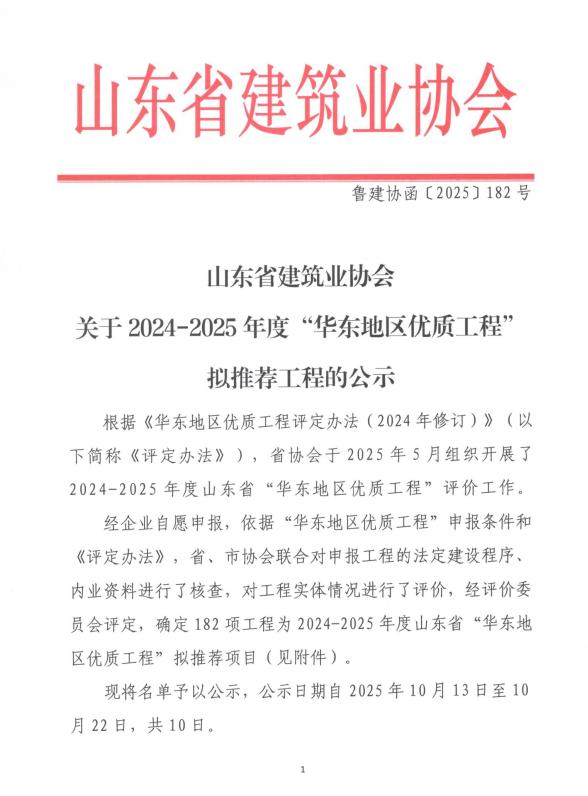 近日,山东省建筑业协会公布2024-2025年度山东省“华东地区优质工程奖”推荐工程名单,学院新校区图书办公综合楼工程荣获“华东地区优质工程”奖。