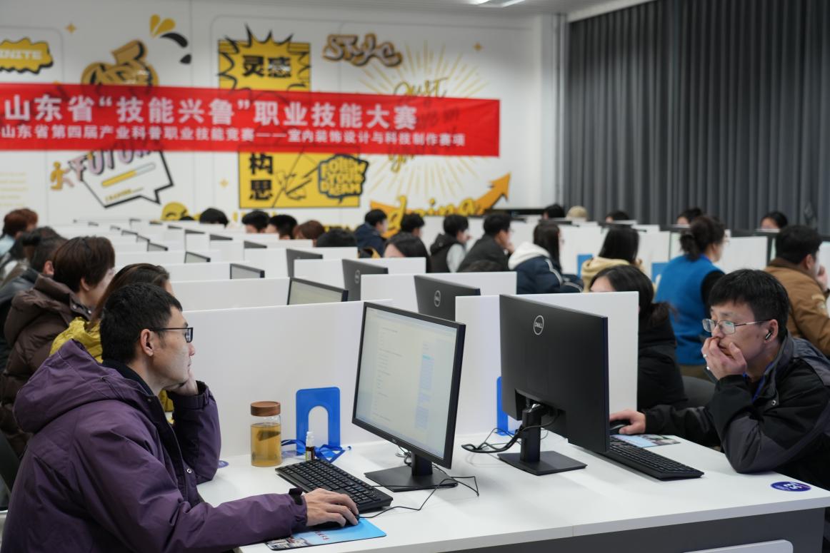 学院高度重视赛事筹备工作,启用全新的3号教学楼作为赛场,配备140台高性能计算机,组建专业赛务团队,从赛场布置到设备调试,从赛务统筹到后勤保障,致力于打造公平、公正、公开的竞技平台。通过“以赛促学、以赛促练、以赛促评”的机制,不仅为全省室内装饰设计从业者与学子提供了展示自我的平台,也为行业筛选出一批兼具理论素养与实操能力的优秀人才,对推动山东省室内装饰设计产业转型升级、助力高技能人才队伍建设具有积极意义。