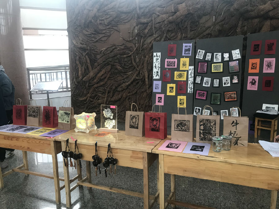 在2020年不平凡的一年中,面对新形势新要求,艺术设计系的师生们在教学实践中不断思考创新,结合文创市场创作软陶、版画、蜡染、金丝沙画、黑白画、香包等多种艺术门类的文创小品。学生们的每件作品都是在老师的指导下精心制作而成。“山东好汉”系列版画更是吸引了学院领导及老师们驻足观赏,是在徐洪震老师指导下精心制作而成,重现了系列经典人物形象,展示了山东人的好汉情怀及仁义美德。另外,田慧老师指导学生用软陶材料创作的摆件和饰品,可爱经典的卡通人物,靓丽的发卡让大家爱不释手,成为本次创意市集的销售爆品。