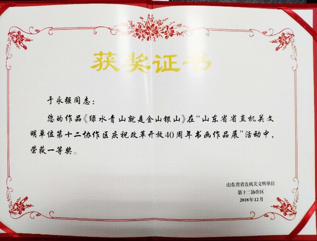 为庆祝改革开放40周年,推动文明单位创建深入开展,2018年12月26日,省级文明单位第十二协作区举办了“庆祝改革开放40周年书画作品展”,kaiyun开云官方在线入口于永强老师的油画作品《绿水青山就是金山银山》荣获一等奖,亓建人老师的布面油画作品《蓝梦》荣获三等奖。