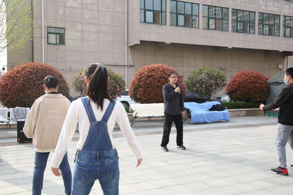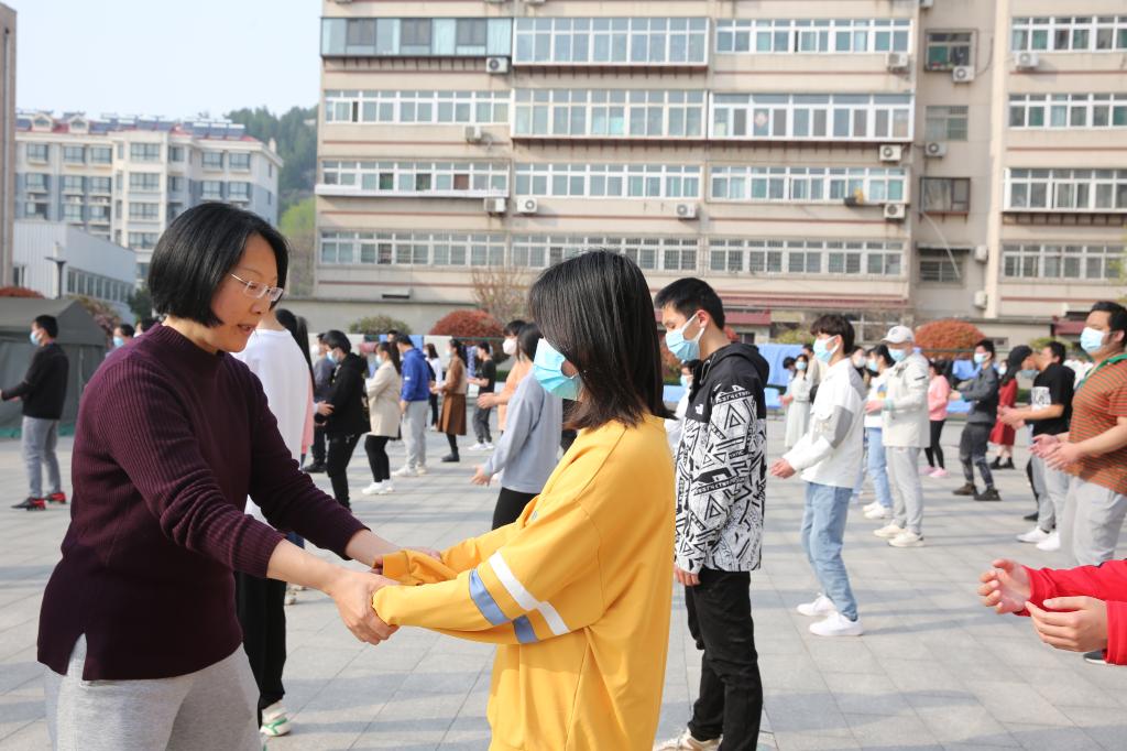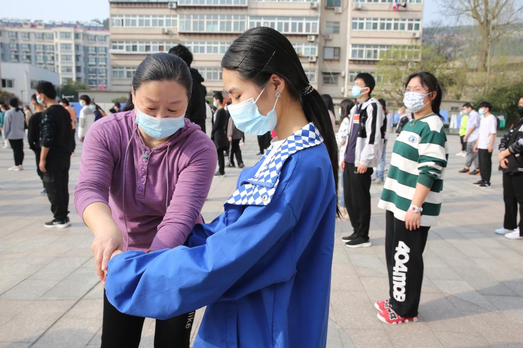 因为视障学生无法看到实际的动作展示,指导老师们需要反复解说动作要领,让视障学生巩固记忆。医学康复系教师和健全生们分散在练习队伍中,对动作不规范的同学进行“一对一、手把手”纠正。