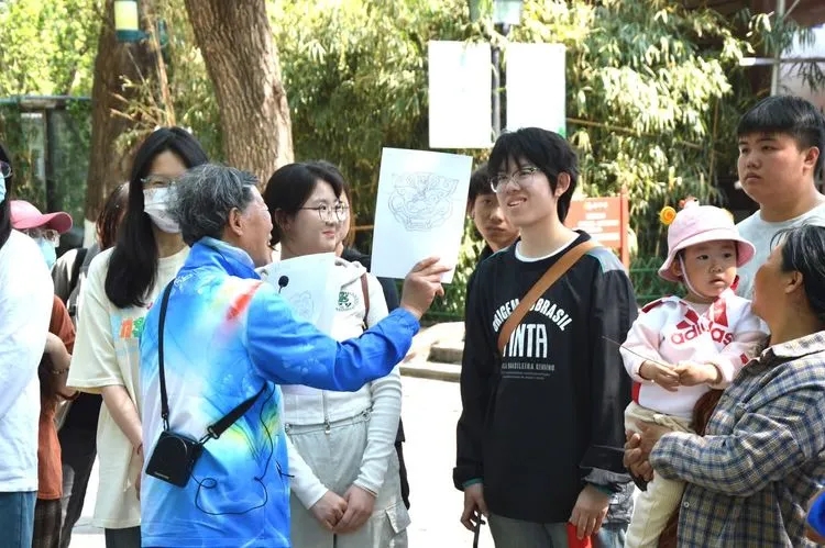 在老济南记忆馆志愿者的带领下,师生来到五龙壁前,观看志愿者手绘龙图案,学习龙文化知识。