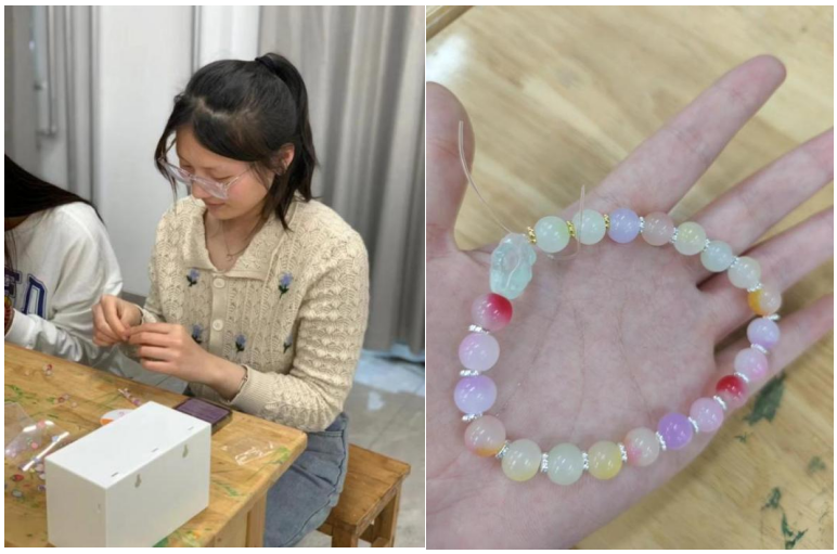 “既得‘珠’缘,欢喜美满”。在制作串珠时,同学们根据喜好精心挑选了不同颜色的珠子进行自由搭配,再按照一定顺序串成手链,展现出独特的品味和创意。串好的手链或者送给自己,或者赠与他人,串联之中抒发情感,营造出轻松愉悦的氛围。
