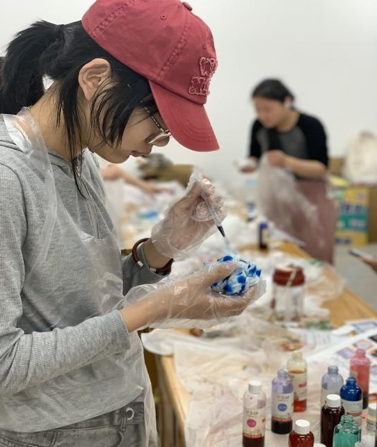 视频学习过后,同学们了解了串珠、羊毛毡和扎染的制作工艺及其深刻寓意,纷纷跃跃欲试,迫不及待选取材料开始动手制作。