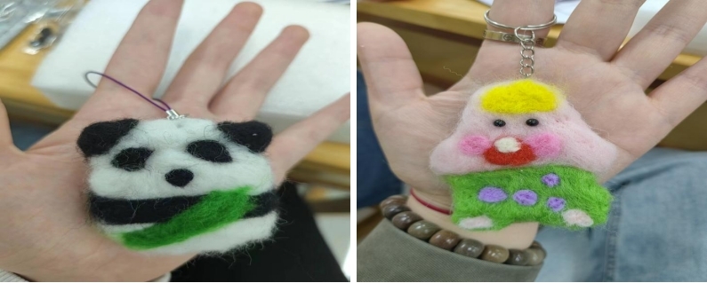 “戳戳寻趣,乐乐无穷”。羊毛毡制作以“戳戳乐”的形式闪亮登场。在一团团柔软的彩色羊毛上,同学们一上一下不停扎戳,使羊毛逐渐紧凑成形,制成小熊猫、派大星等可爱挂件。制作过程中,同学们互相交流、解决困难,在互帮互助中增进了彼此情谊。