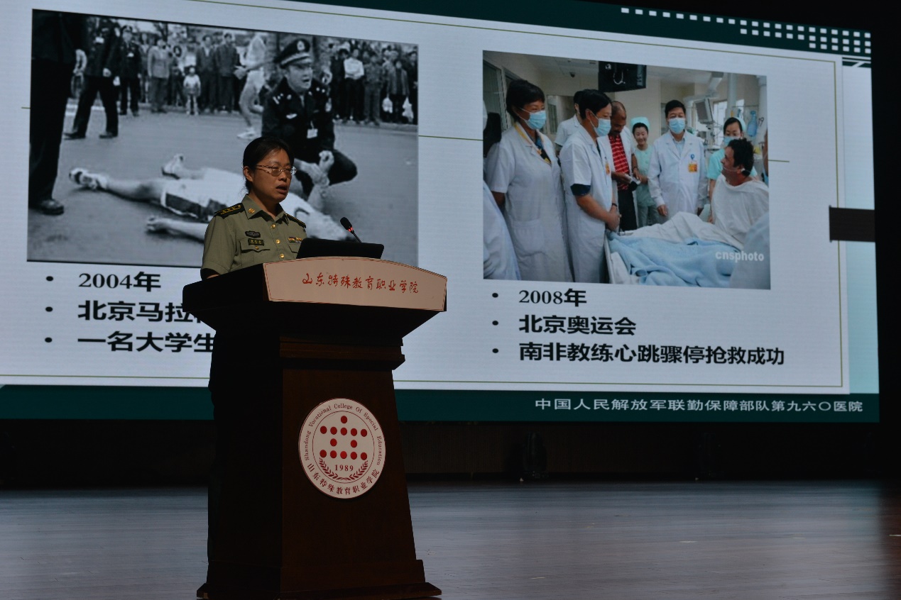 解放军第960医院急诊科副主任医师仲薇薇向同学们详细介绍了心肺复苏的具体操作流程,并进行了现场演示,帮助同学们提高对心肺复苏等急救方法的认识,掌握简单的应急救护知识。