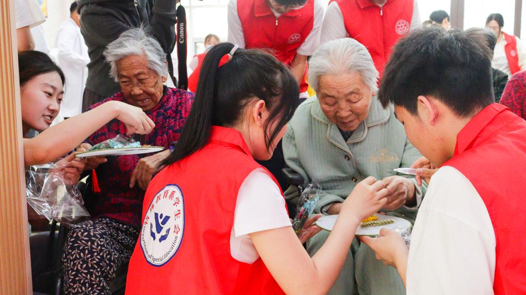 在马山敬老院,特殊教育系“青暖桑榆”志愿服务队与老人们同唱《我和我的祖国》《团结就是力量》等歌曲,与大家共读《红岩》,并将书中精彩片段以话剧形式进行演绎,同学们以真挚的感情、精彩的对白、精准的人物形象刻画,让现场观众置身阅读盛宴,沉浸式体会革命先辈们的坚定信仰与大无畏精神;与社区老人一起做团扇、聊家常,现场氛围其乐融融,共筑红色基因的传承梦。