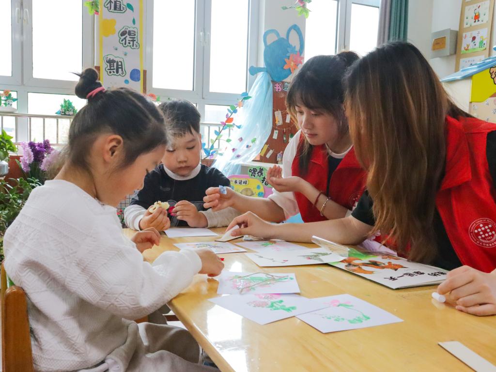 在北汝幼儿园,特殊教育系“护苗计划”的志愿者们创新形式,打破传统阅读边界,通过《谁咬了我的大饼》《我的幸运一天》绘本表演,用生动形象的语言和动作带领孩子们体验“沉浸式阅读”,与孩子们一同制作书签,在“玩书、做书、演书”的过程中感受读书乐趣,共筑乐享阅读的成长梦。