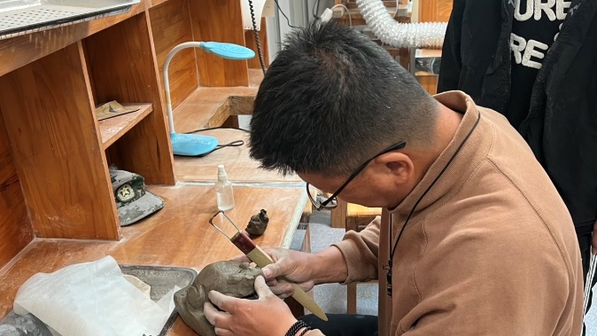 第二场教学以“玉石题材造型创新”为主题,聚焦艺术创新维度,鼓励学生突破传统,大胆融入现代元素。讲座中,王利老师深入探讨跨界融合、材料创新及文化主题现代表达,为学生打开艺术创作新思路。教学过程中,王利老师采用玉石结合青泥的创新教学法,引导学生在传承基础上融入现代设计理念。实践环节,设置创意转化任务,指导学生完成兼具传统工艺特征与现代审美表达的创新作品。