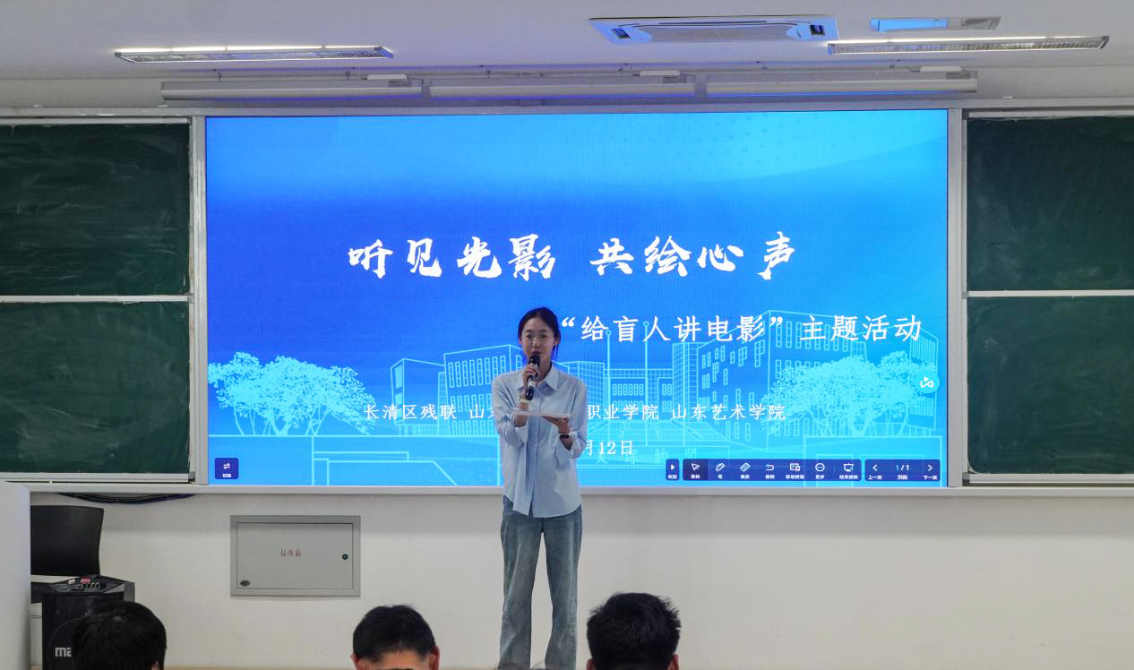 活动伊始,山东艺术学院的志愿者们为视障学生们带来了一场别开生面的无障碍观影体验。志愿者们声情并茂、抑扬顿挫,配合着《啥是佩奇》《老杜》《拾荒少年》等影片的进度,用生动的语言在视障学生们的脑海中勾勒出一幅幅鲜活的画面,让他们仿佛身临其境,真正“看”懂了电影。
