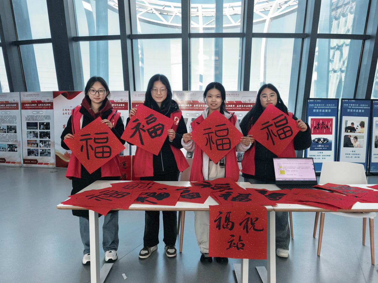 活动现场设立专属“祝福站”,为特殊学生群体提供贴心帮扶。听障学生手语编排祝福、现场展示,视障学生录制新年祝福、一展歌喉,即可兑换福礼。志愿者全程一对一协助,让每一位参与者都能感受温暖与喜悦。摄影组全程跟进拍摄,定格下笔墨创作的精彩瞬间与师生领福的喜悦笑颜。