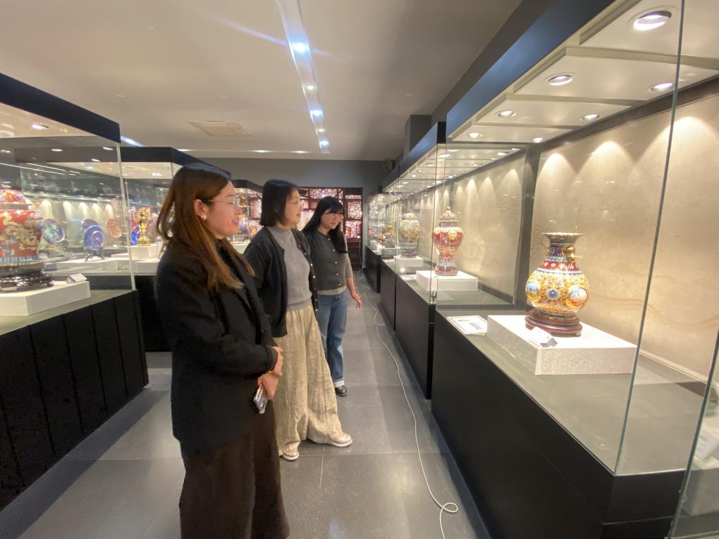 在企业经理张鑫的陪同下,学院考察团首先参观了企业珍宝馆,鉴赏多款景泰蓝国礼精品。这些作品工艺精湛、形制典雅,尽显传统非遗工艺魅力,使参观者感受到景泰蓝技艺在当代的传承与创新。随后,深入生产车间,观摩景泰蓝制胎、掐丝、点蓝、烧制、打磨、镀金全工艺流程,细致了解各环节工艺要点与匠人实操规范,明晰了非遗技艺人才培养的核心要点,为专业教学对接产业需求找准方向。