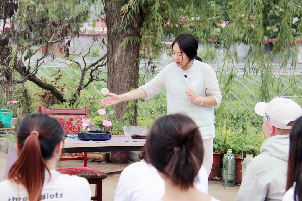 下午2时,在茶园农舍,杨海宁老师进行了第二讲:“茶香袅袅 硕果累累——中华茶艺、花艺现场教学”。杨海宁通过茶席布置、茶器介绍深刻解读了其中所蕴含的哲学道理。随后,杨海宁展示了红茶茶艺并讲授红茶冲泡技术要点,现场指导学生冲泡红茶、品饮红茶,引导学生通过学习茶艺冲泡体会博大精深的茶文化。最后,杨海宁以现场采摘的花草为同学们讲解中式插花,引导同学们发现美、鉴赏美、感悟美,将优秀传统文化融入到与专业实践中。