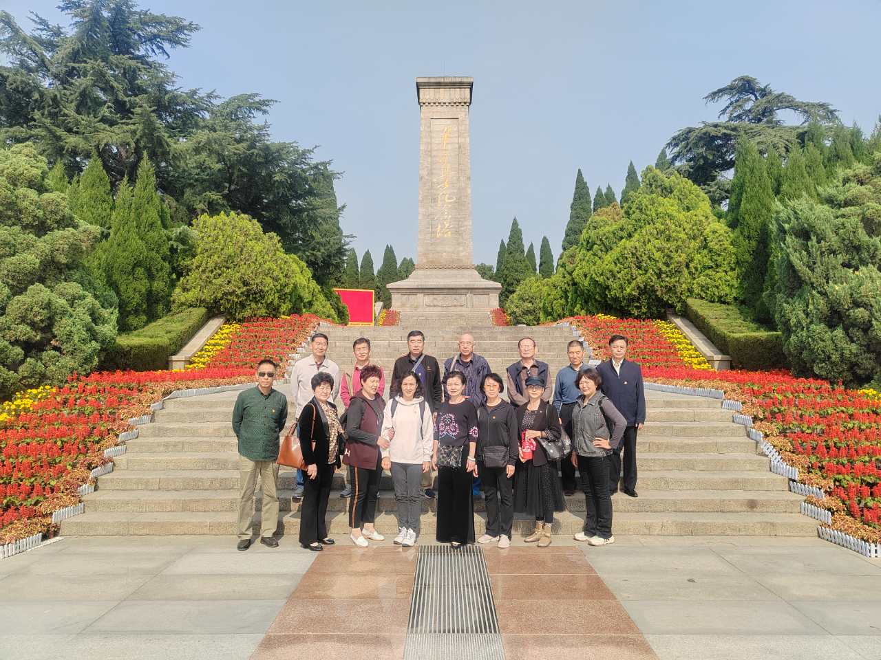 在革命烈士纪念塔下,在鲜红的党旗映照中,全体党员重温入党誓词,并在展馆外合影留念。