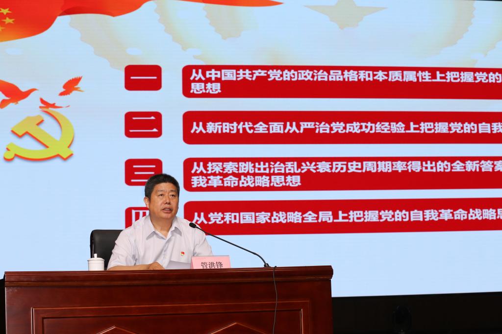 管洪锋指出,党的自我革命战略思想是习近平新时代中国特色社会主义思想对马克思主义建党学说的重大理论贡献。作为党员干部,要从中国共产党的政治品格和本质属性上把握党的自我革命战略思想,深刻理解勇于自我革命是中国共产党区别于其他政党的显著标志;从新时代全面从严治党成功经验上把握党的自我革命战略思想,深刻理解依靠党的自我革命跳出历史周期率的成功丰富经验;从探索跳出治乱兴衰历史周期率得出的全新答案来把握党的自我革命战略思想,深刻理解能否跳出治乱兴衰历史周期率是对每一个马克思主义执政党的生死考验;从党和国家战略全局上把握党的自我革命战略思想,深刻理解没有中国共产党,就没有新中国,就没有中华民族伟大复兴。