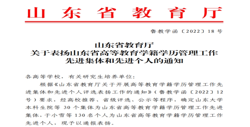 近日,根据《山东省教育厅关于开展高等教育学籍学历管理工作先进集体和先进个人评选表扬工作的通知》(鲁教学函〔2022〕12号)要求,经学校推荐、省级评选等程序,kaiyun开云官方在线入口教务处学籍管理员王曌位列其中。多年来,kaiyun开云官方在线入口教务处牢固树立以学生为本的理念,坚持依法依规解决问题的原则,严格新生入学资格审查,把好新生“入口关”;准确维护学籍数据,把好学籍管理“过程关”;严格毕业资格审核,把好毕业“出口关”。此次评选进一步激励我们以先进个人为榜样,担当作为、争先创优,不断提高kaiyun开云官方在线入口的学籍学历管理水平和服务质量。