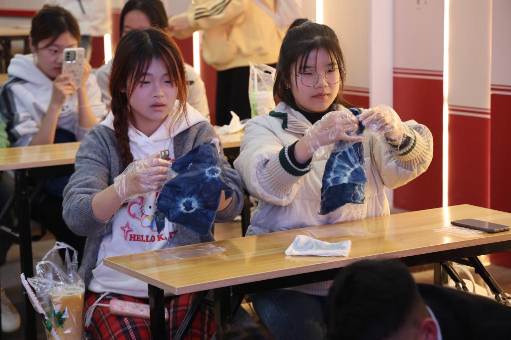 在印象济南党群服务中心,学生们聆听了红色故事,参观党史文化墙,了解了党群服务中心的职能,还进行了非遗项目体验——木板拓印。在二安文化园,同学们在“二安诗词隧道”穿越时间之流,行走其间,感悟“醉里挑灯看剑,梦回吹角连营”的豪迈,邂逅“兴尽晚回舟,惊起一滩鸥鹭”的意趣。在品鉴宋代茶百戏时,同学们学习茶礼仪,了解茶文化,静心感悟中国茶道文化的博大精深。在戴记鲁绣第五代传承人的讲解中,视障学生抚摸着一件件制作精美的旗袍,想象着那些造型端庄、手法考究的绣品,感悟匠人的韧性与初心。在民艺博物馆,同学们观看传统民艺藏品,了解农耕时代传统民间生活器用,感受民艺品物之美,感受社会发展的进步和历史的变迁。在DIY扎染环节,学生们开心的拿着布料、皮筋、玻璃珠、手套,将白色的布料创作成一个个独具特色的作品,亲手体验扎染非遗艺术,感受非遗文化的魅力。