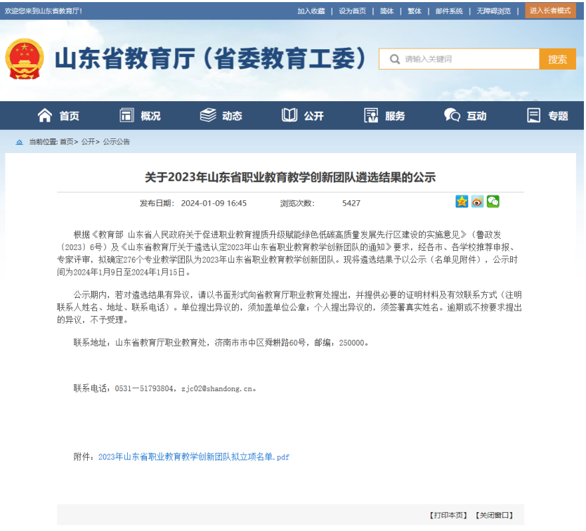 近日,山东省教育厅发布《关于2023年山东省职业教育教学创新团队遴选结果的公示》,张睿主任负责的教学团队成功入选2023年山东省职业教育教学创新团队。
