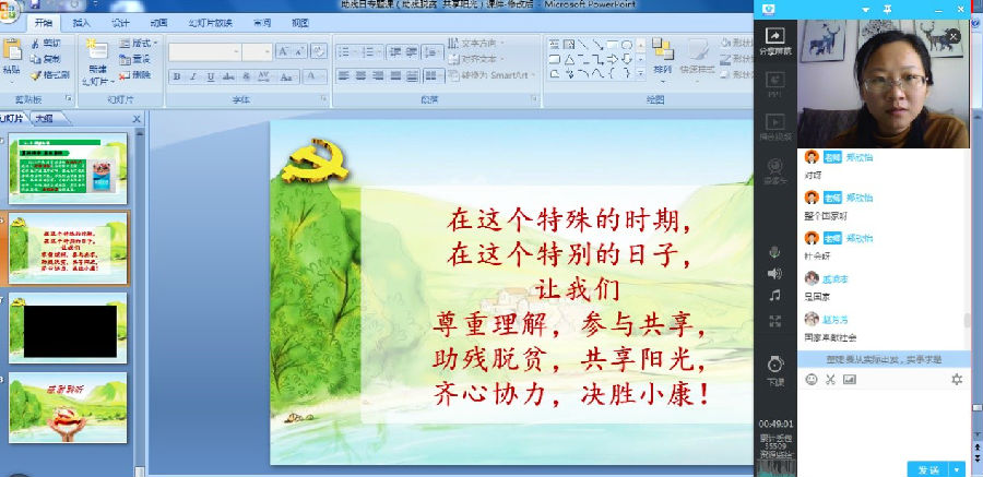 在此次专题思政课中,我部思政教学团队结合教材内容与我国30年助残日资料,帮助学生全面了解我国残疾人事业30年发展历程。从“扶贫助残,我们知多少”“精准扶贫,我们在路上”“我们当自强”几个方面精心准备,充分挖掘扶残助残、精准扶贫中的育人元素,让习总书记的“2020年全面建成小康社会,残疾人一个也不能少”的暖心话播种在听障学生的“多彩课堂”,传入视障学生的“聆语课堂”,走进肢体障碍学生的“心扉课堂”。同时,还介绍了大量鲜活的残疾人自强模范事迹,教育引导学生感受中国力量、中国精神,让整节思政课更加的“接地气”。