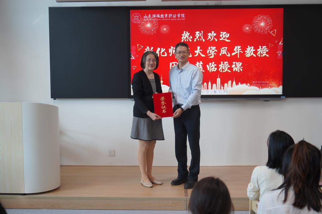 开班仪式上,李心沁为台湾彰化师范大学复健咨商研究所教授兼所长凤华颁发客座教授荣誉证书,并对凤华教授团队前来授课表示热烈欢迎。